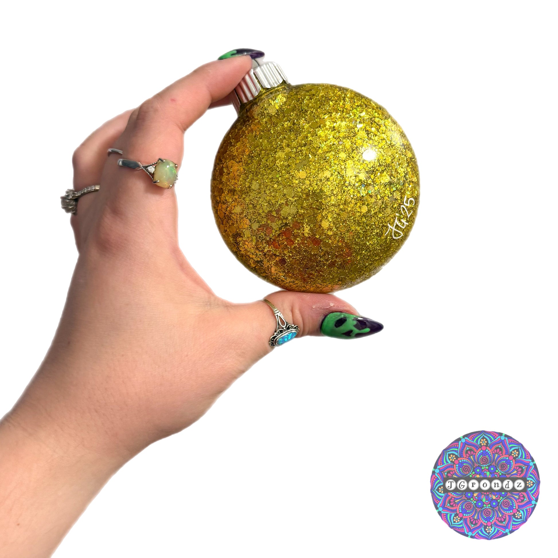 This ornament is glittered on the inside with polycrylic to adhere the glitter to the inside of the bulb.