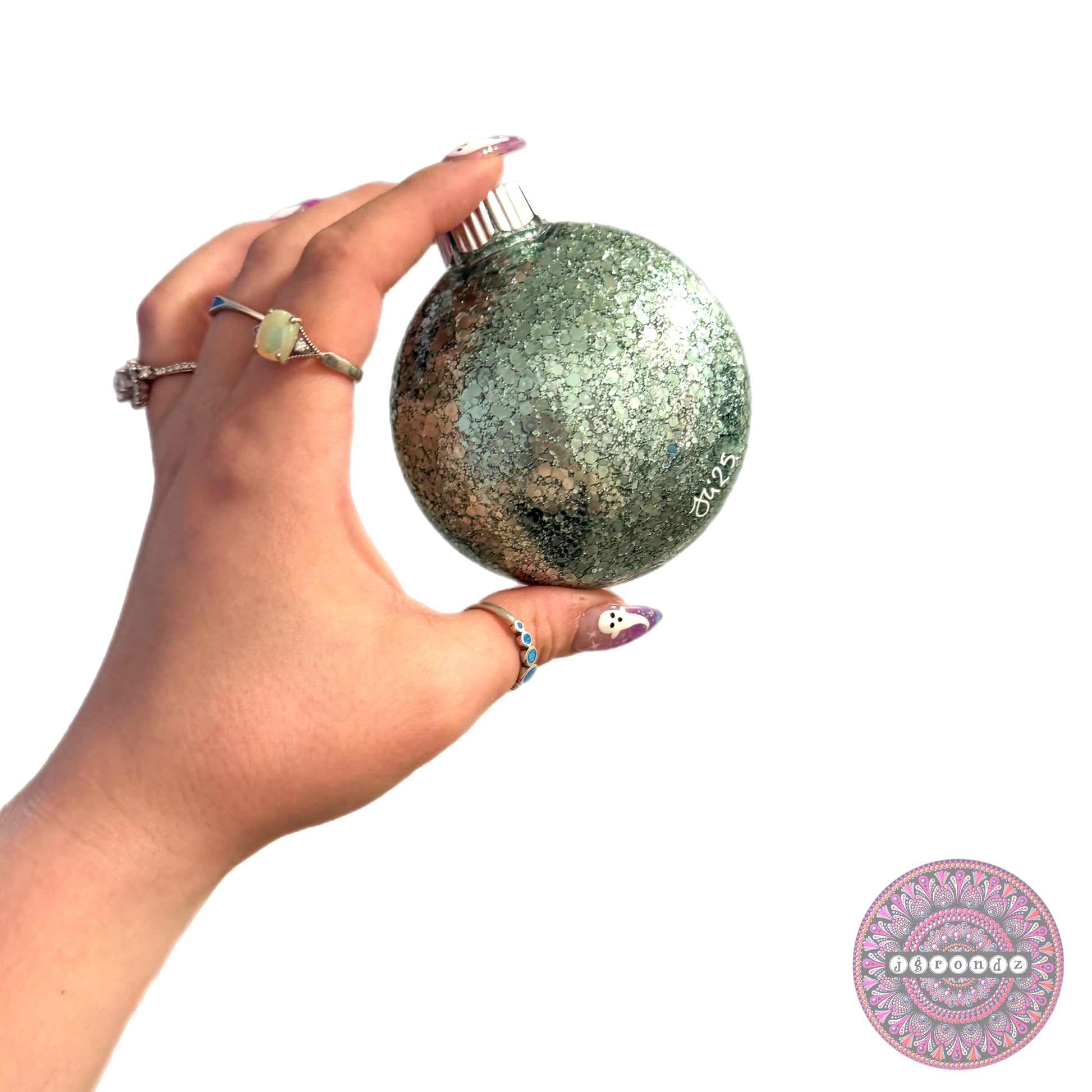 This ornament is glittered on the inside with polycrylic to adhere the glitter to the inside of the bulb.