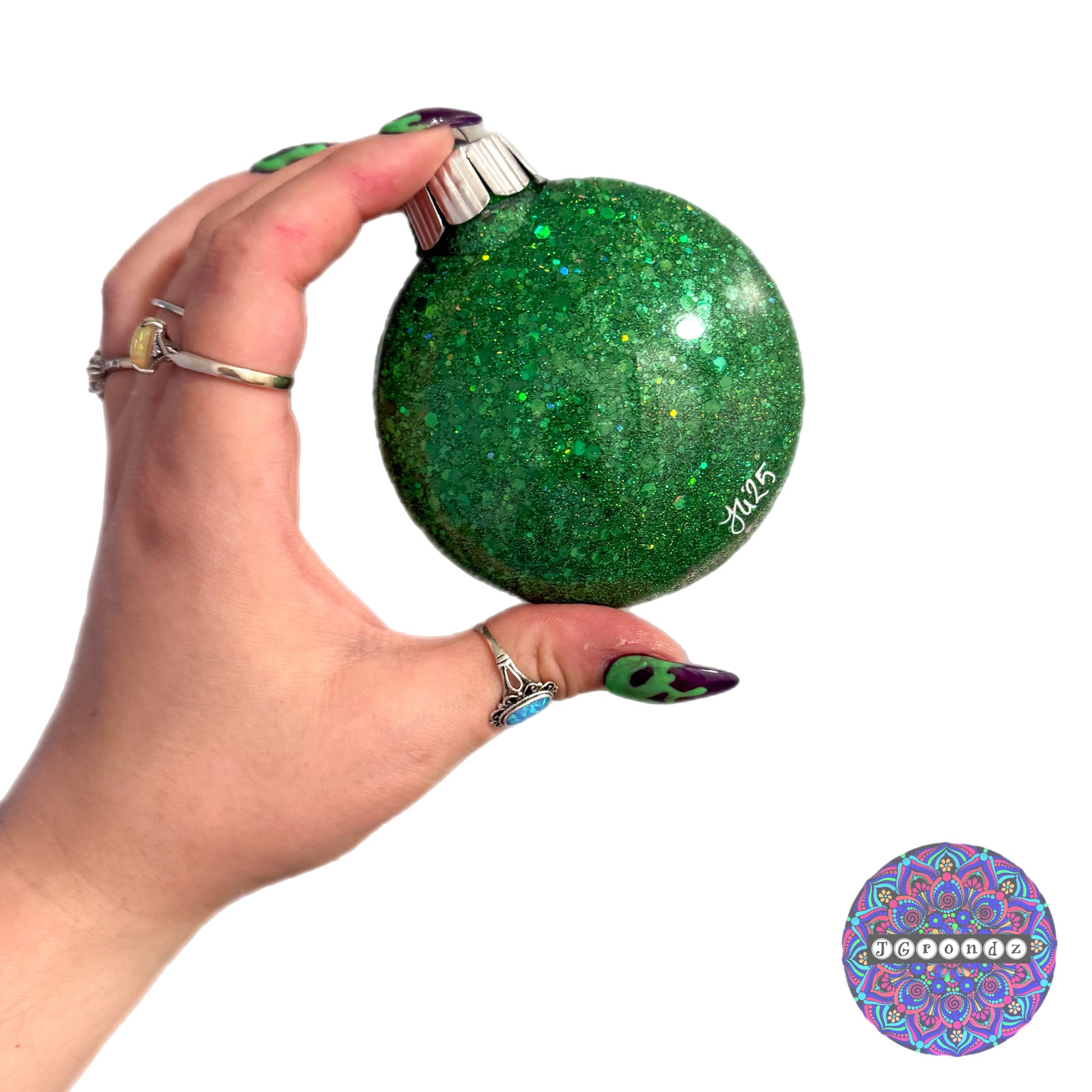 This ornament is glittered on the inside with polycrylic to adhere the glitter to the inside of the bulb.