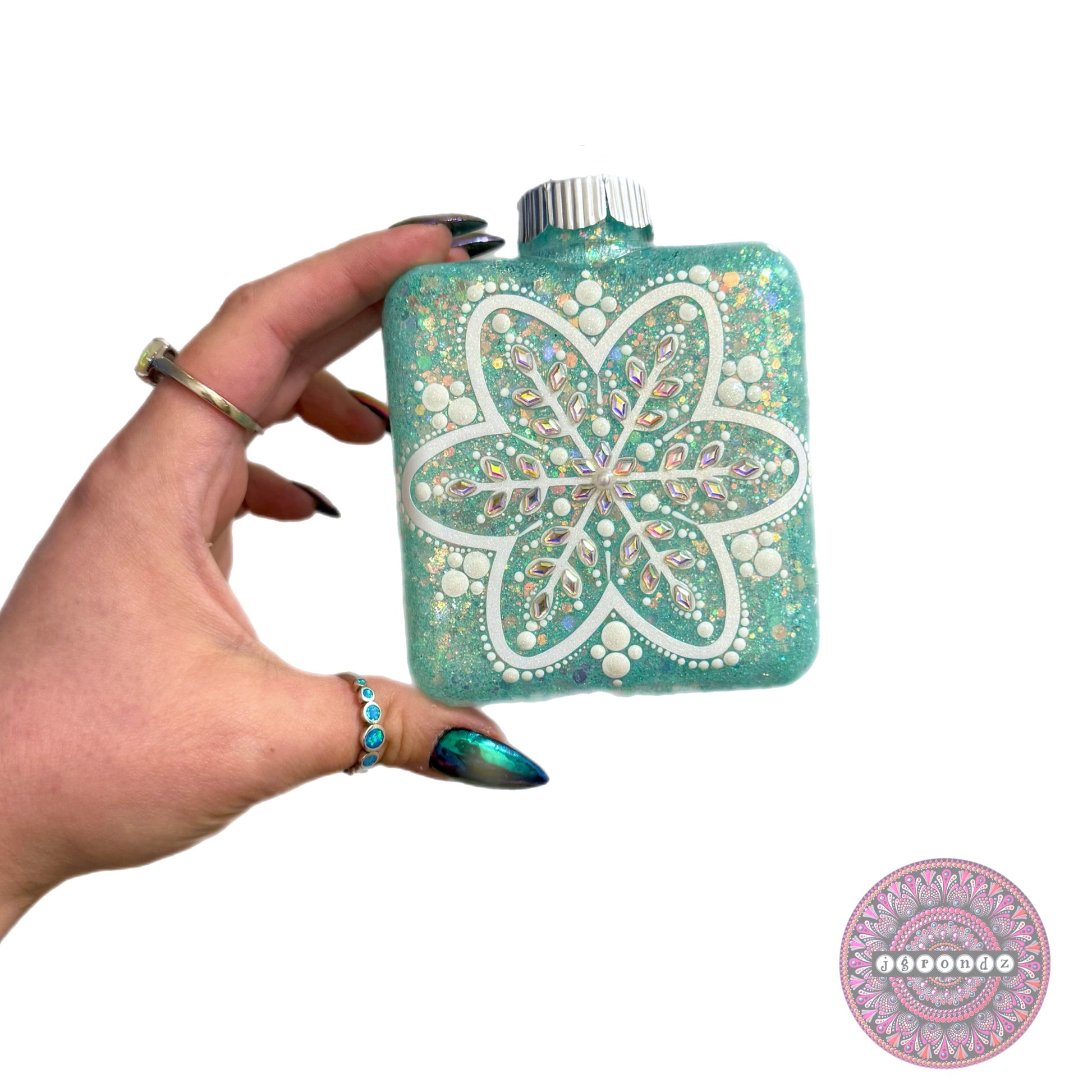 A mandala dot art design is hand painted on the front with sparkly vinyl accents! Sealed with a high gloss sealant to protect the design!