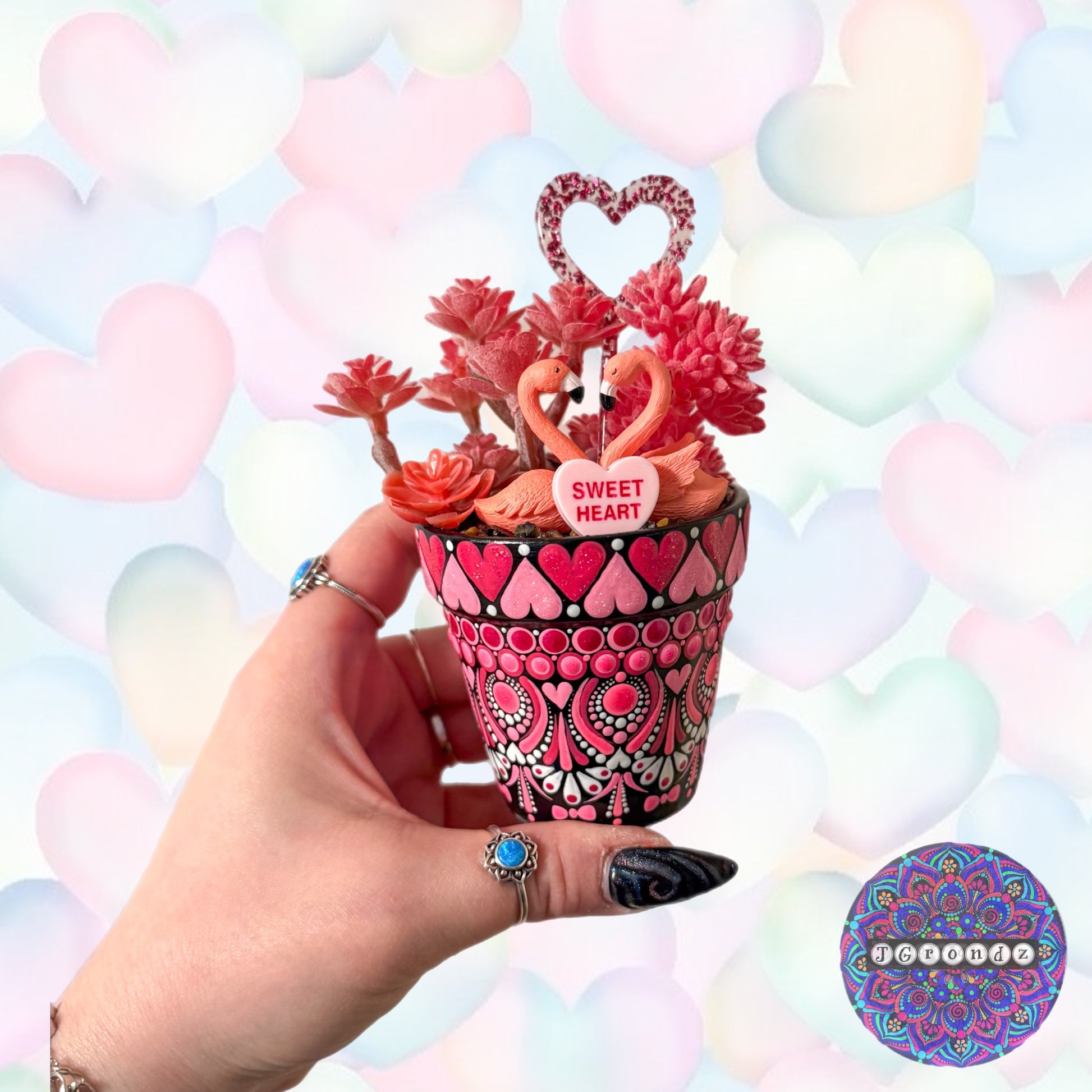 A hand painted design complete with faux succulents! Featuring flamingos and a conversation heart!
