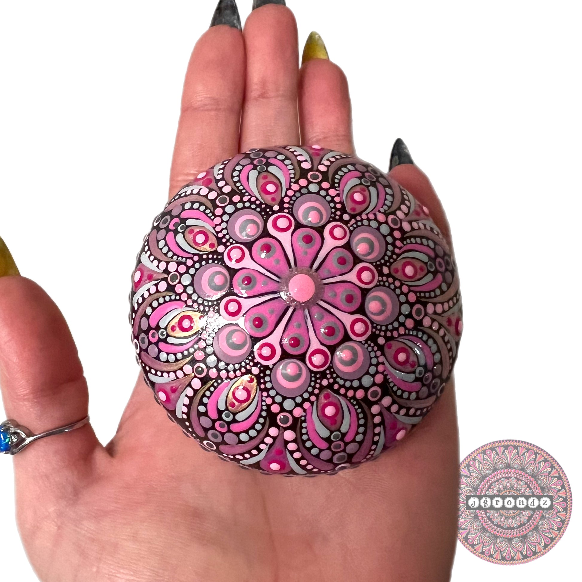 A hand painted mandala design on a hand casted perfectly round stone!