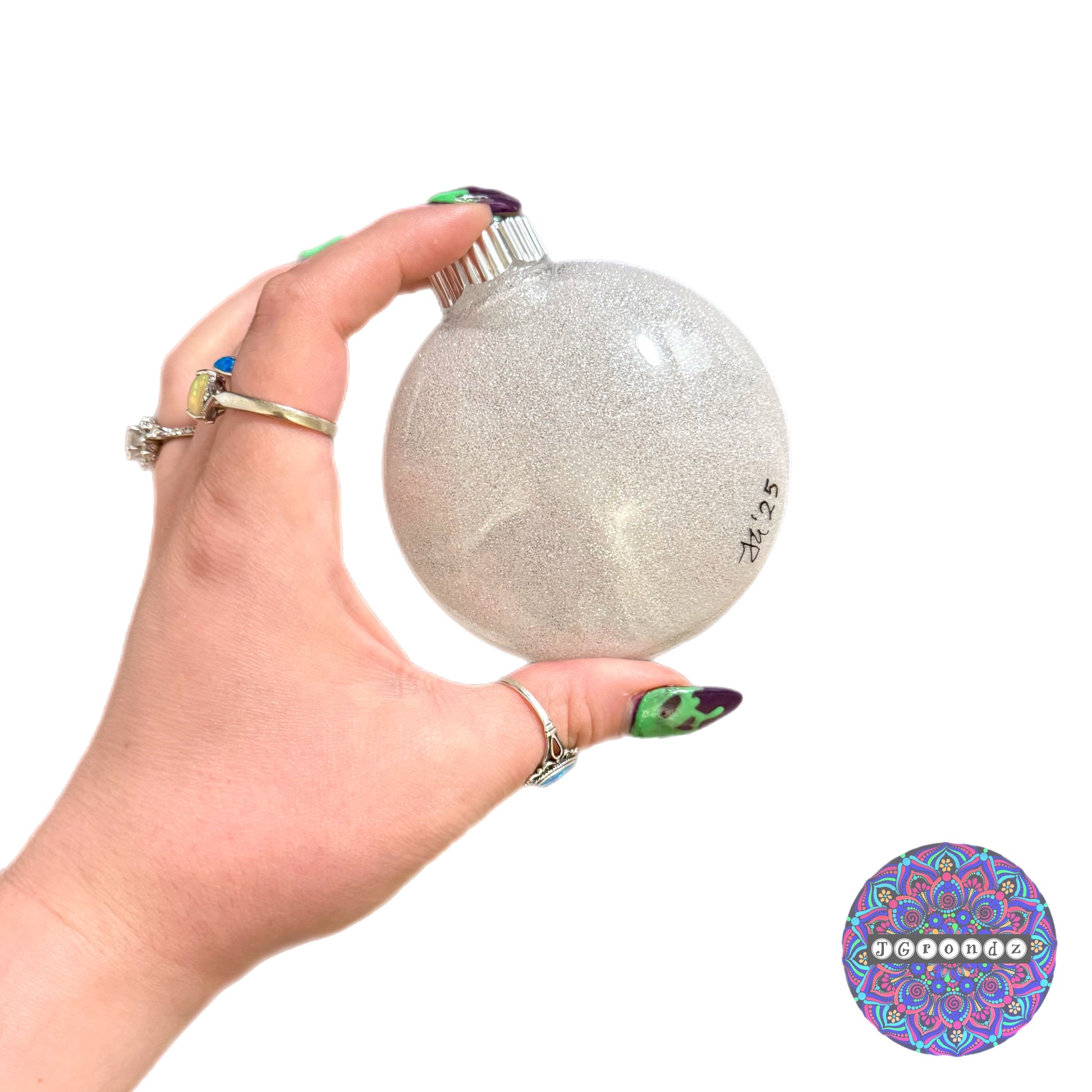 This ornament is glittered on the inside with polycrylic to adhere the glitter to the inside of the bulb.