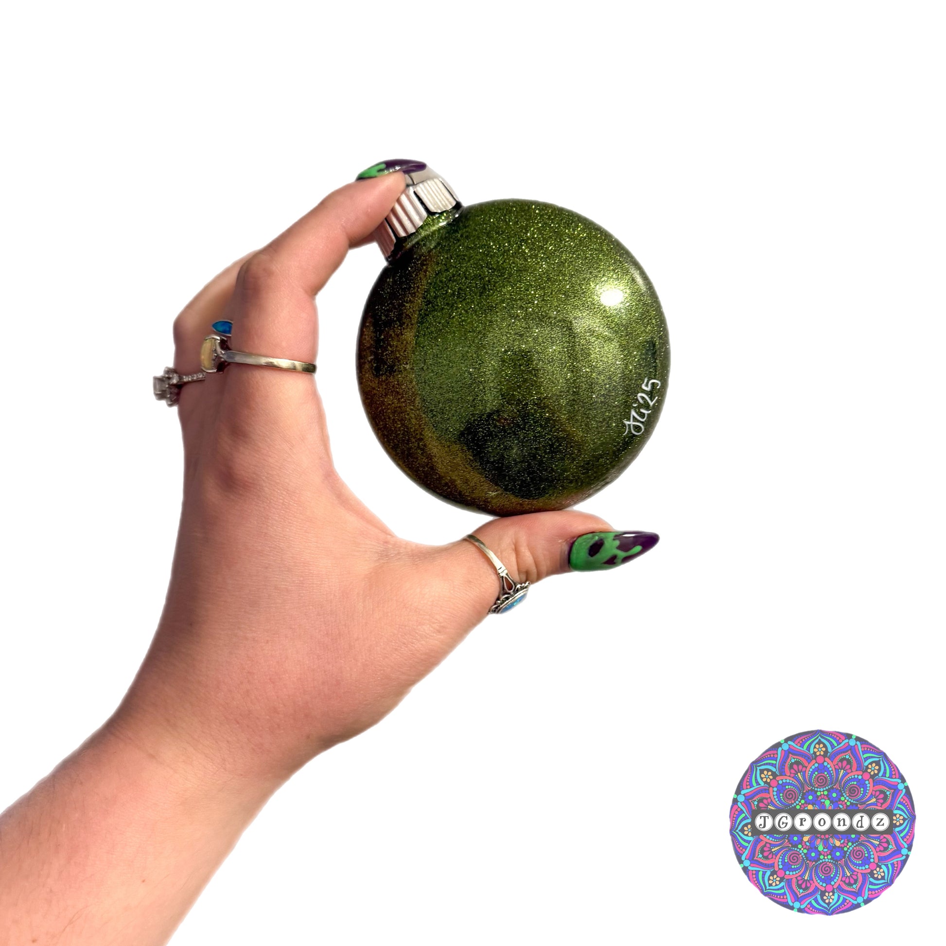 This ornament is glittered on the inside with polycrylic to adhere the glitter to the inside of the bulb.