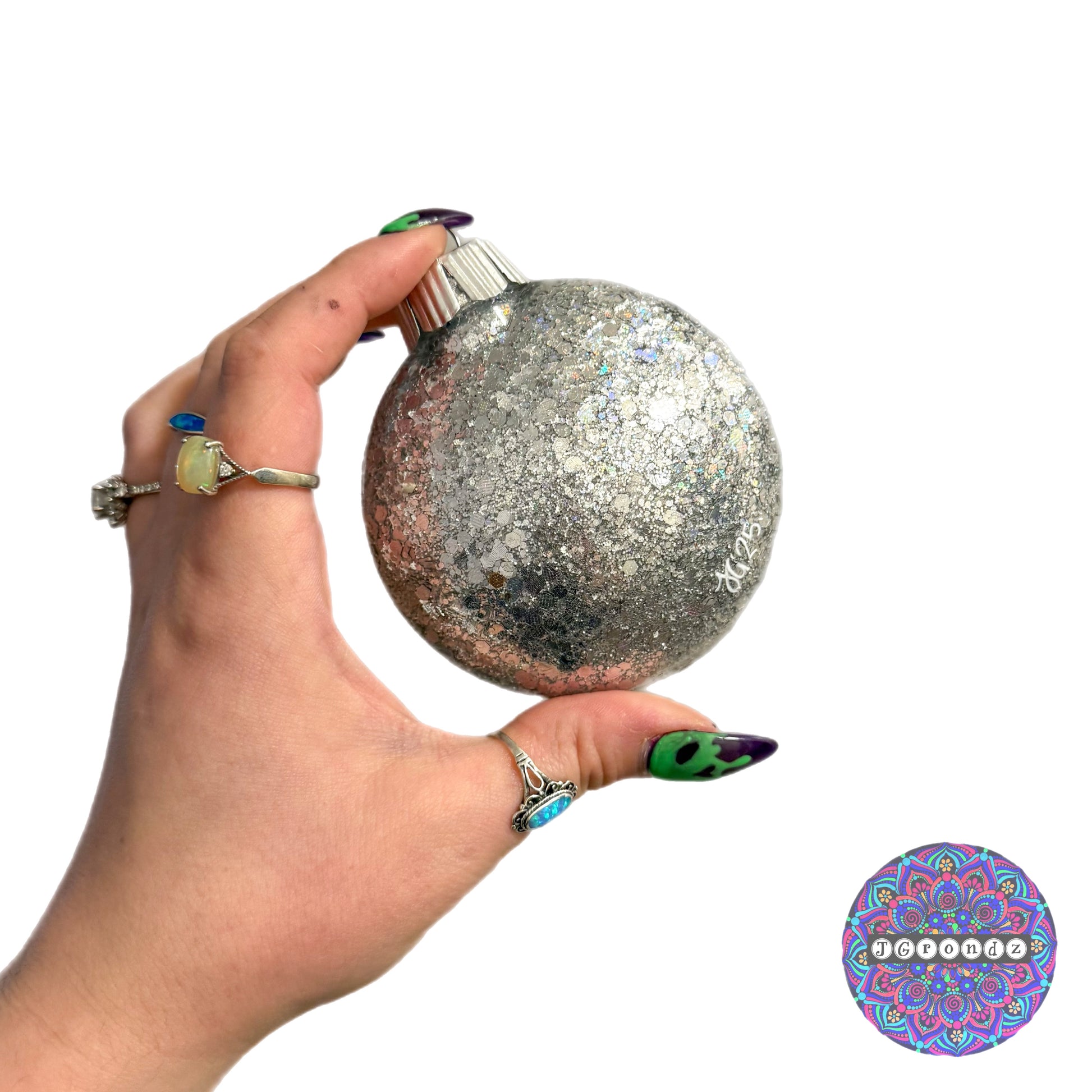 This ornament is glittered on the inside with polycrylic to adhere the glitter to the inside of the bulb.