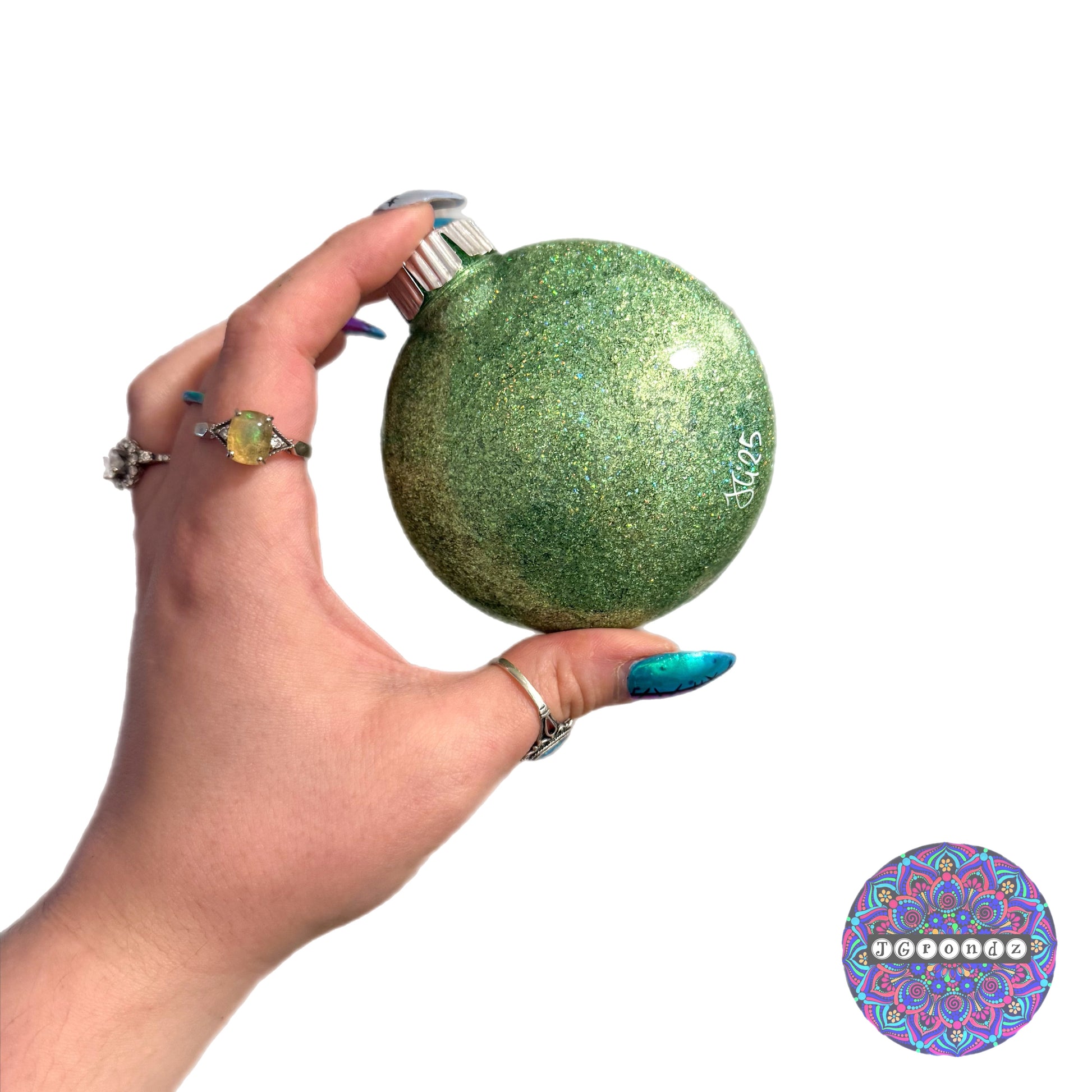 This ornament is glittered on the inside with polycrylic to adhere the glitter to the inside of the bulb.