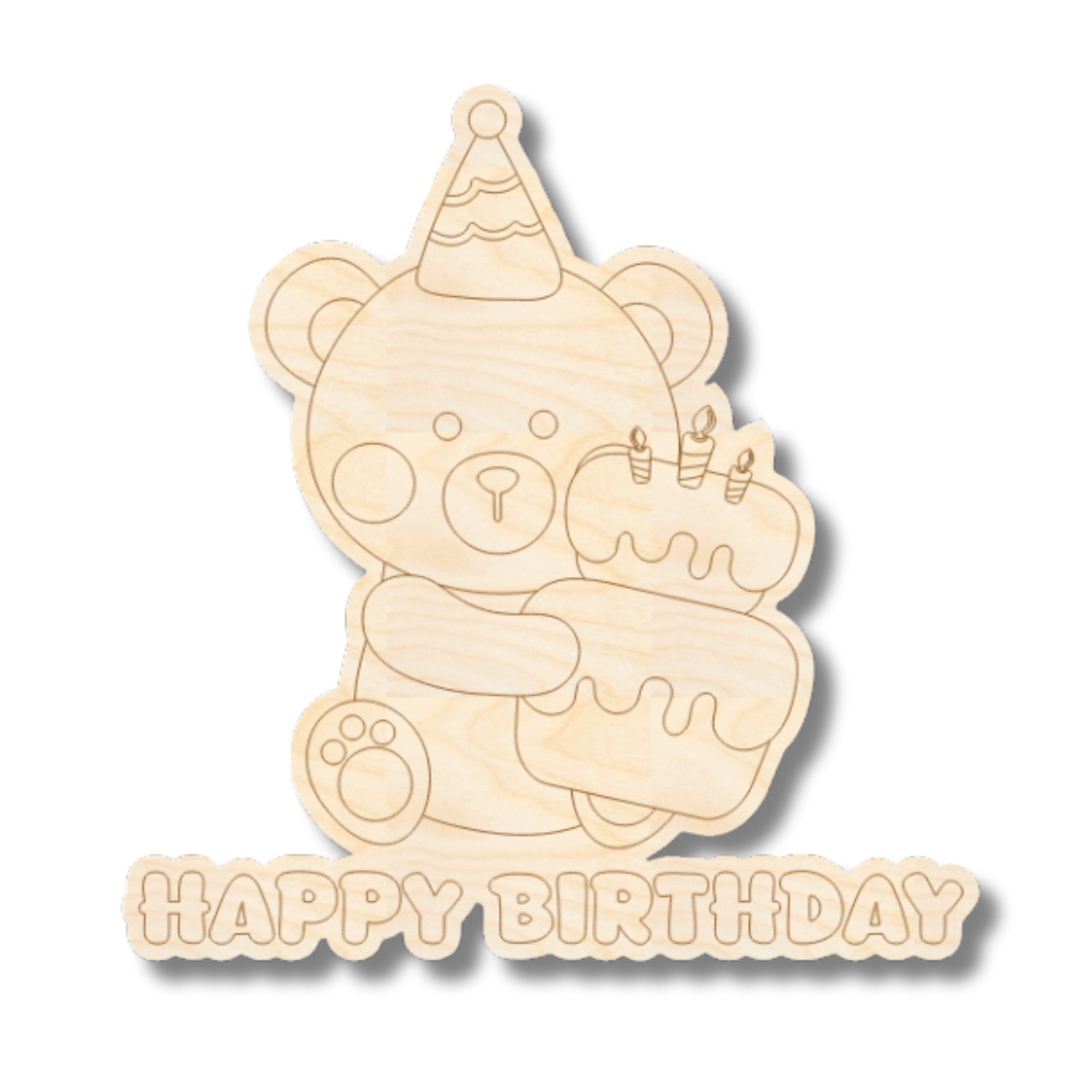 Unfinished Wood Etched Birthday Bear with Cake Shape | Paint By Line Crafts | up to 30" DIY