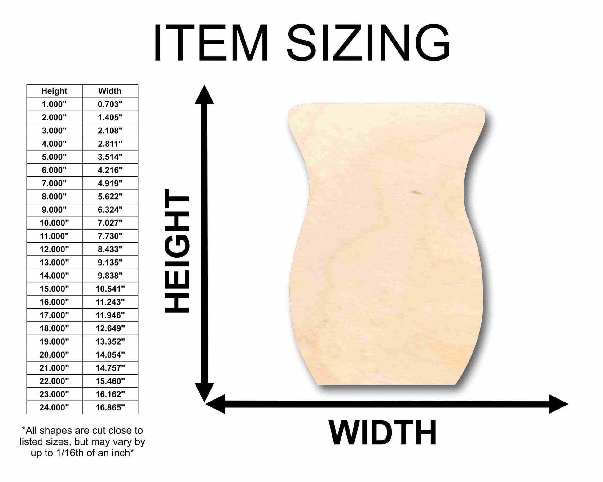 Unfinished wood shapes are available from 3" up to 48" (Some intricate shapes will not be available at smaller sizes)