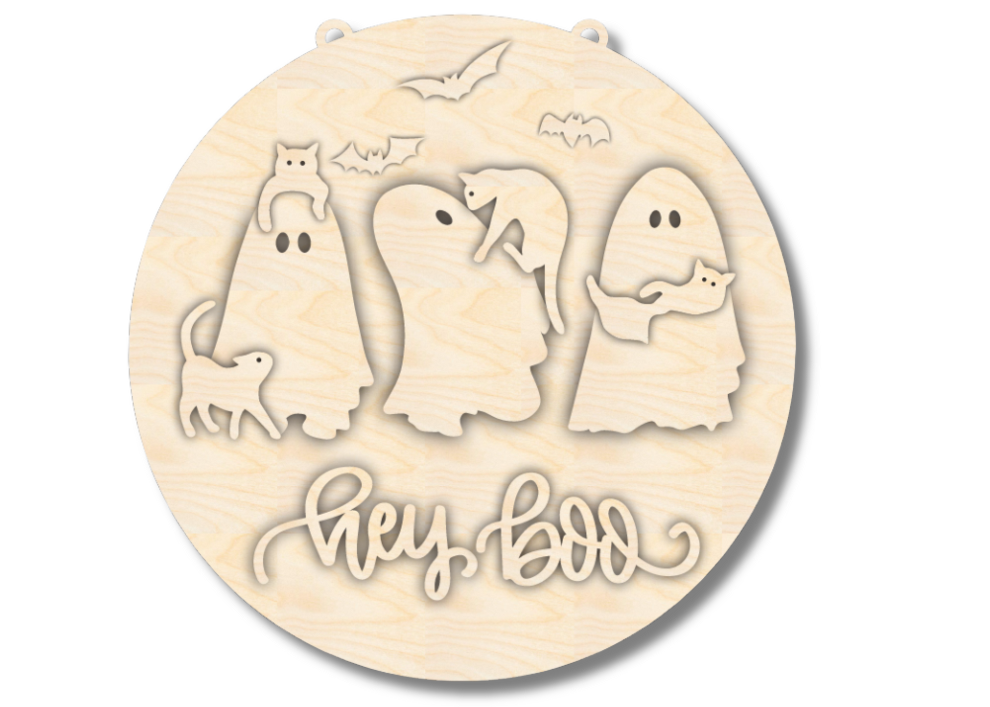 Unfinished Wood Hey Boo Ghost Cat Door Sign Kit | Wood Craft Cutouts | 1/4" Thick |