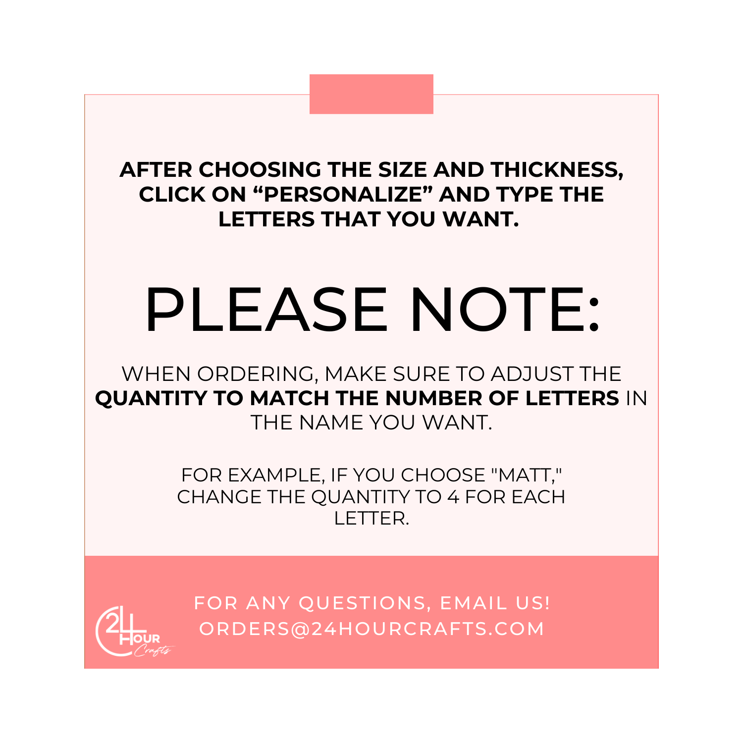 Simply select your desired size and thickness, then click the "Personalize" button. Type in the letter(s) you want, and adjust the quantity based on how many letters you'd like to order!