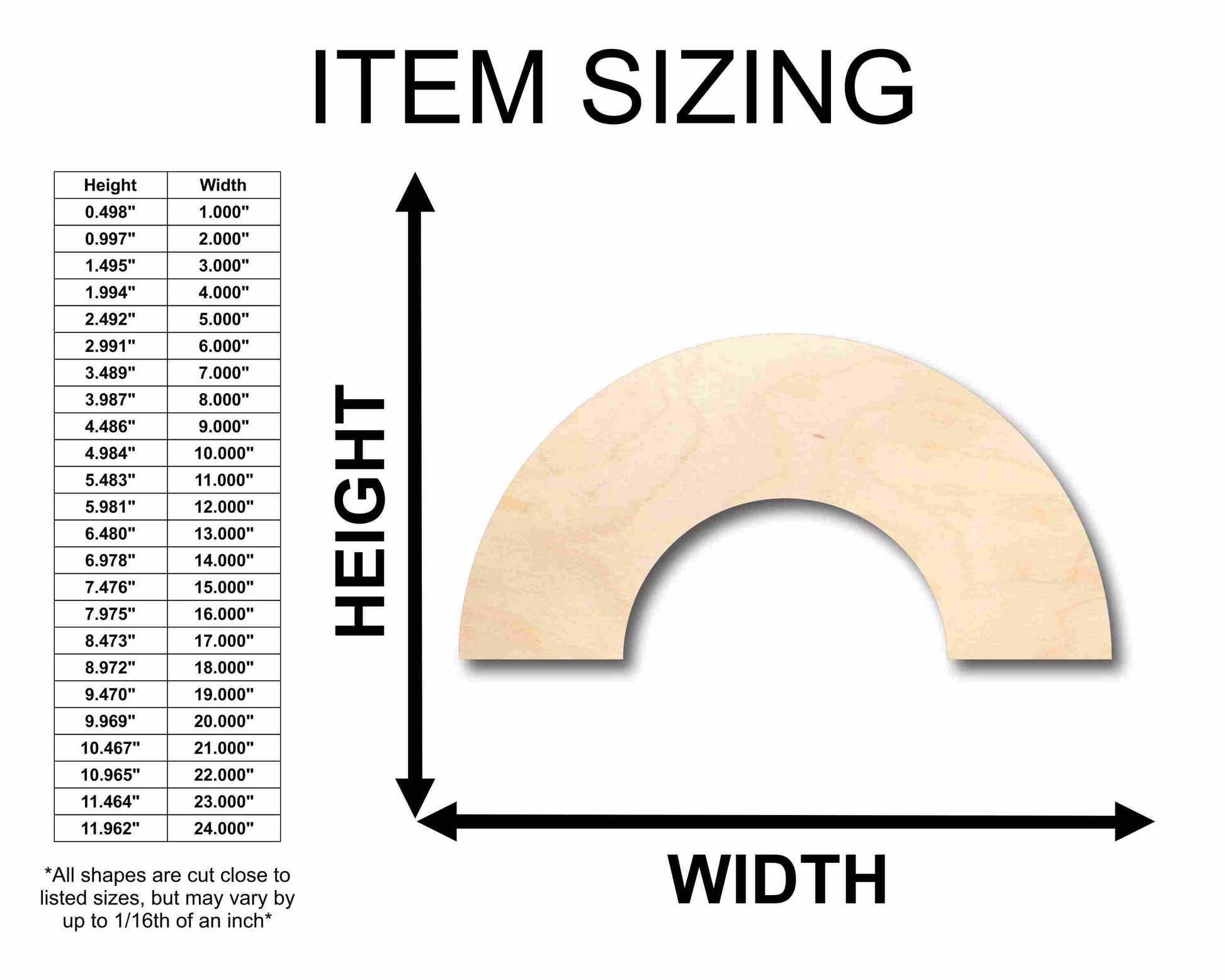 Unfinished wood shapes are available from 3" up to 48" (Some intricate shapes will not be available at smaller sizes)