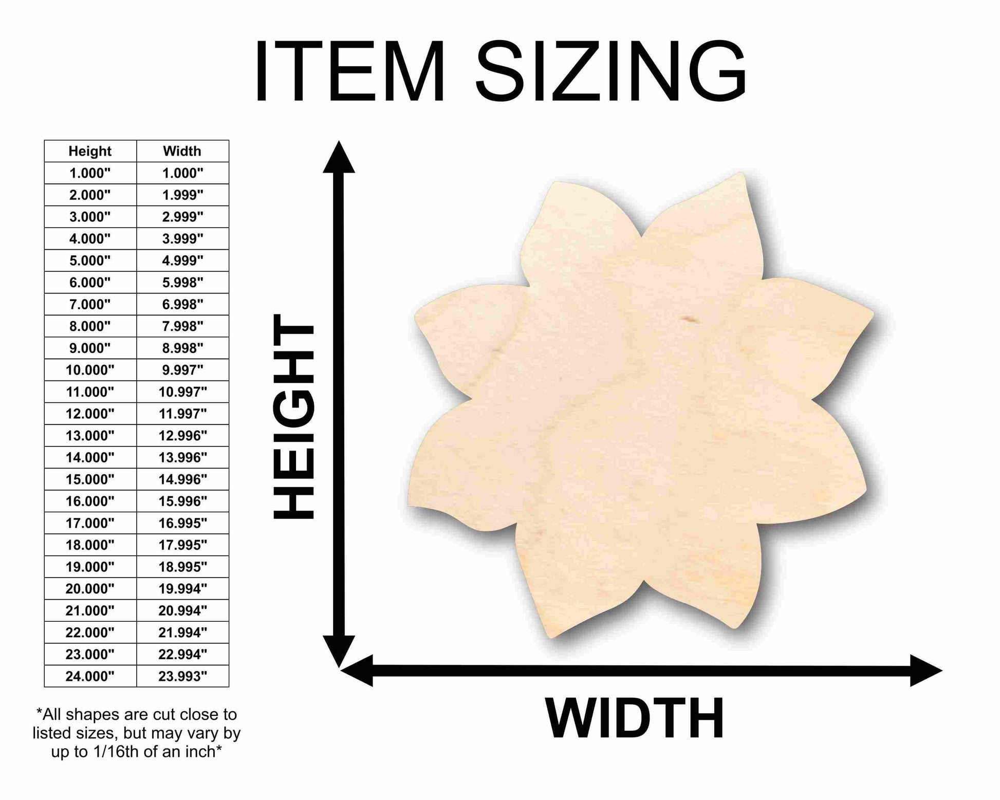 Unfinished wood shapes are available from 3" up to 48" (Some intricate shapes will not be available at smaller sizes)